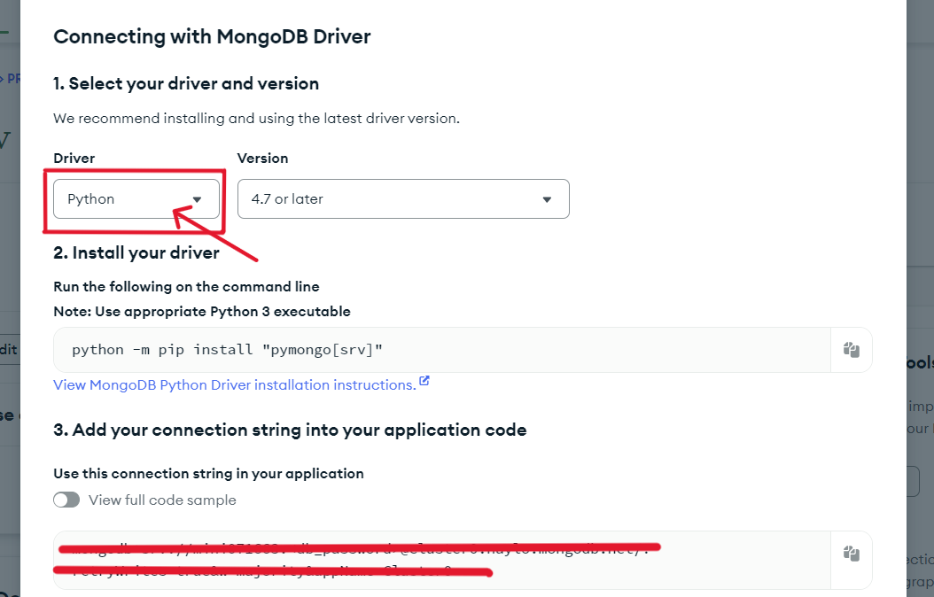● Mongo Atlas로 들어가서 연결하려는 데이터베이스가 있는 클러스터의 python 연결 코드를 가져온다