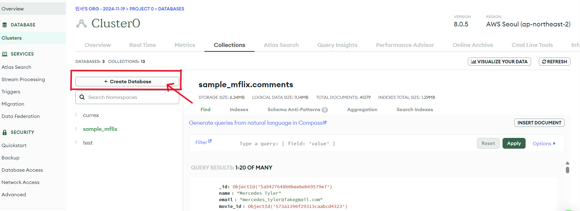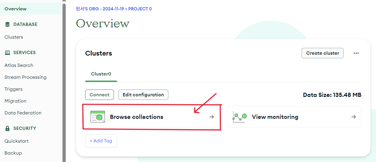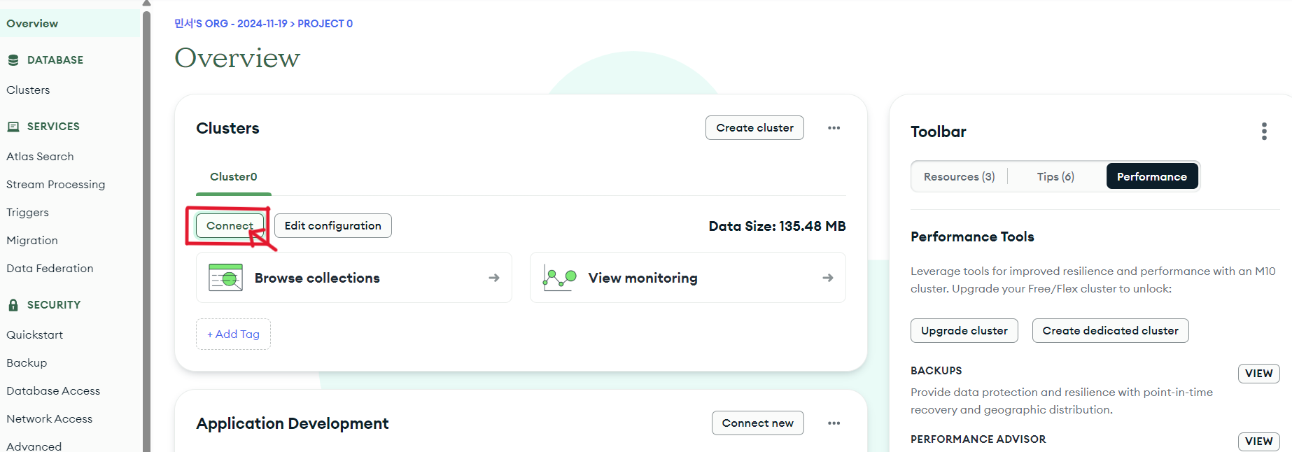 여기서 Cluster0은 MongoDB Atlas의 클라우드 서비스에서 제공하는 기본 클러스터이다. MongoDB Altas의 클러스터 안에서 데이터베이스를 생성 및 관리 할 수 있다. 즉, 클러스터는 데이터베이스를 포함하는 컨테이너 역할을 한다고 생각하면 된다.
